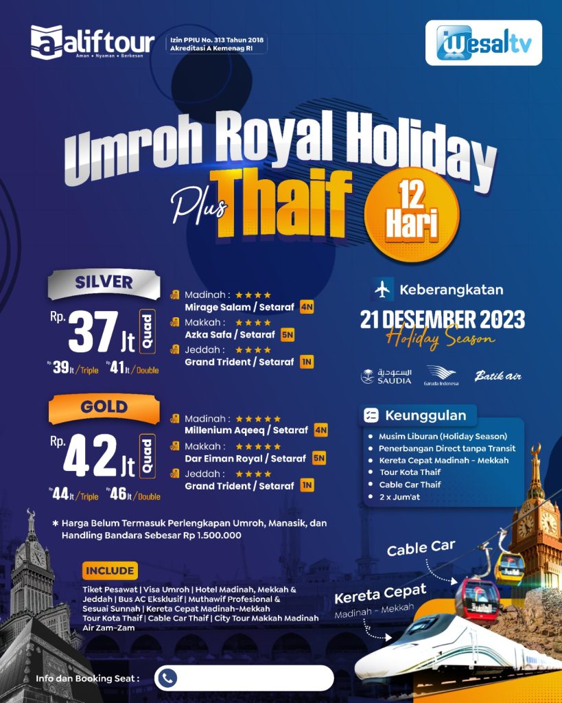 PILIHAN PAKET UMROH ALIF TOURINFO SISA SEAT ALIF TRAVEL Paket Umrah “Semua Bisa Umroh” – Pengalaman Ibadah Istimewa LIHAT PAKET> Paket Umrah Syawal Pelataran Haram LIHAT PAKET> Umroh Istimewa Plus Healing ke Kota Thaif – Batch 2 LIHAT PAKET> Paket Umroh Reguler Itikaf Ramadhan 1446 H LIHAT PAKET> Paket Umroh Extra Hemat Itikaf Ramadhan LIHAT PAKET> Paket Umroh Awal Ramadhan – 9 Hari LIHAT PAKET> Umroh Hemat Mubarok Plus Thoif LIHAT PAKET> Umroh Royal Holiday – Paket 12 HARI Plus Thaif LIHAT PAKET> PROGRAM BADAL HAJI ALIF TOUR LIHAT PAKET> PAKET HAJI PLUS MASA TUNGGU 7 TAHUN LIHAT PAKET> PAKET HAJI FURODA 2023 LIHAT PAKET> PAKET UMROH ROYAL HOLIDAY PLUS THOIF LIHAT PAKET>